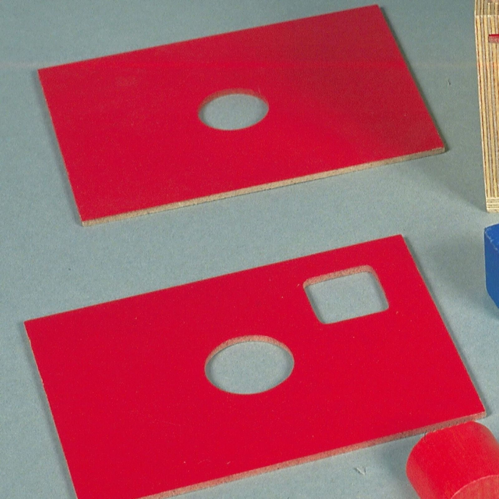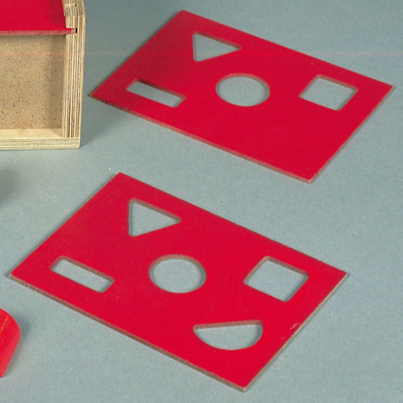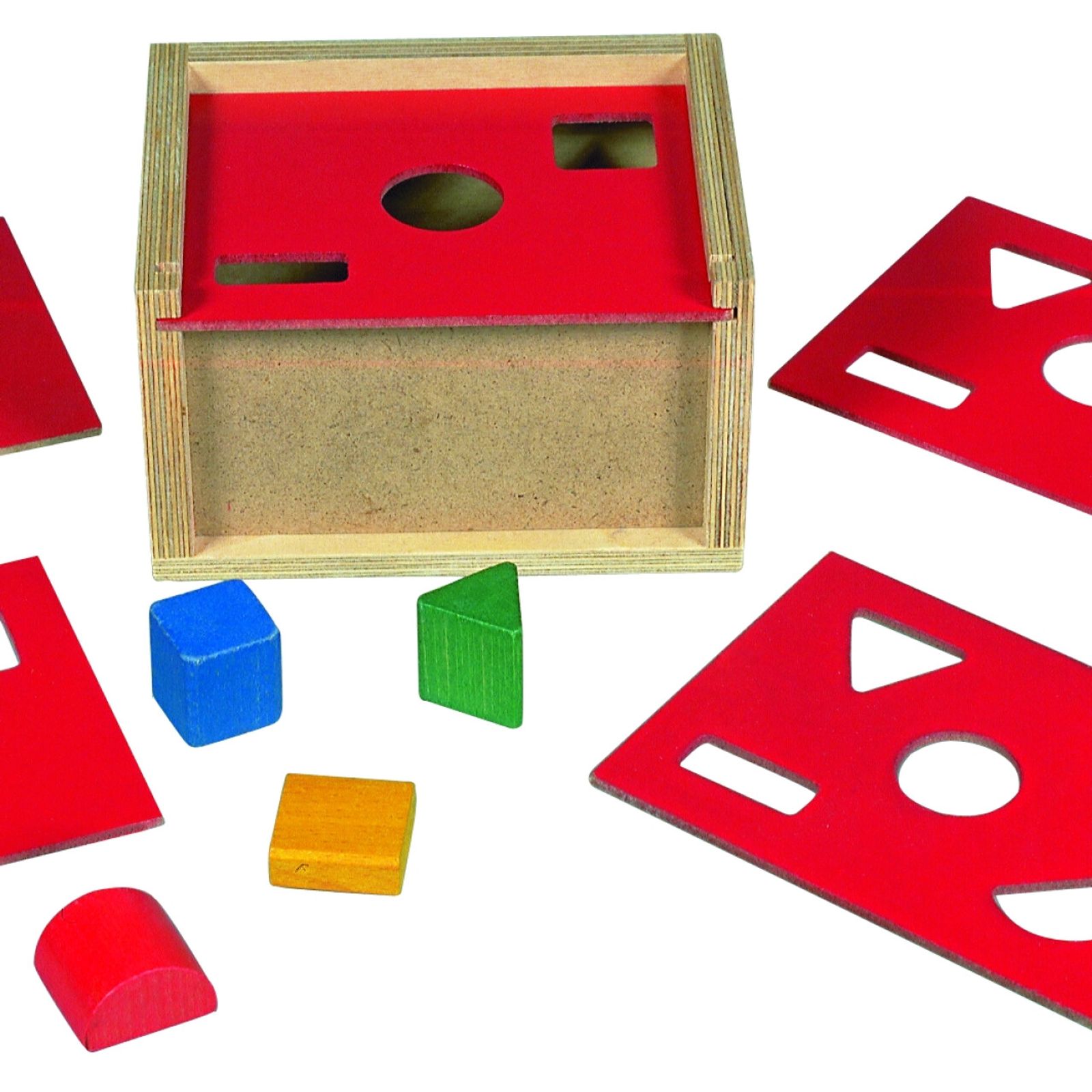 It consists of a little robust wooden box with 5 different tops that you can swap around, each top has a hole for different shapes provided going from 1-5. Along with it comes 5 different shapes as well.